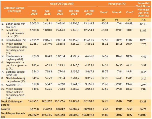 Sedangkan nilai ekspor lemak dan minyak hewan/nabati pada 5 bulan pertama 2025 adalah US$ 12,56 miliar. Ekuivalen dengan 11,85% dari total ekspor non-migas.