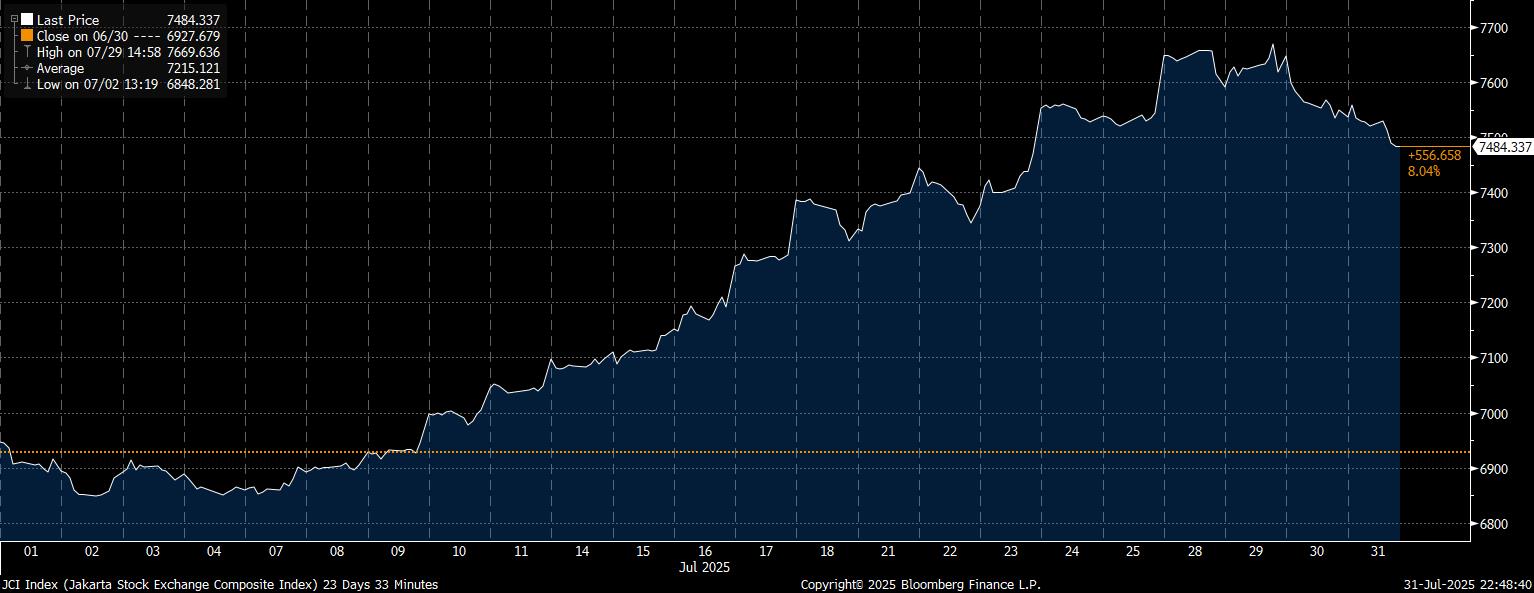 Berdasarkan data Bloomberg, Indeks Harga Saham Gabungan (IHSG) melaju semringah, dengan kenaikan 8,04% sepanjang perdagangan saham 1–31 Juli 2025 dan ditutup pada posisi 7.484,34.