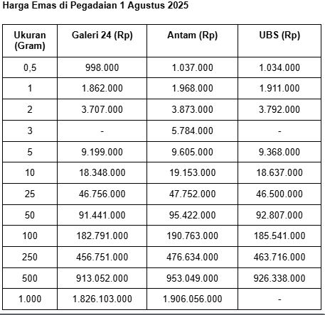 Sedangkan untuk ukuran 1 gram, harga emas Galeri 24 di Pegadaian adalah Rp 1.882.000. Minus Rp 16.000 dalam sehari.