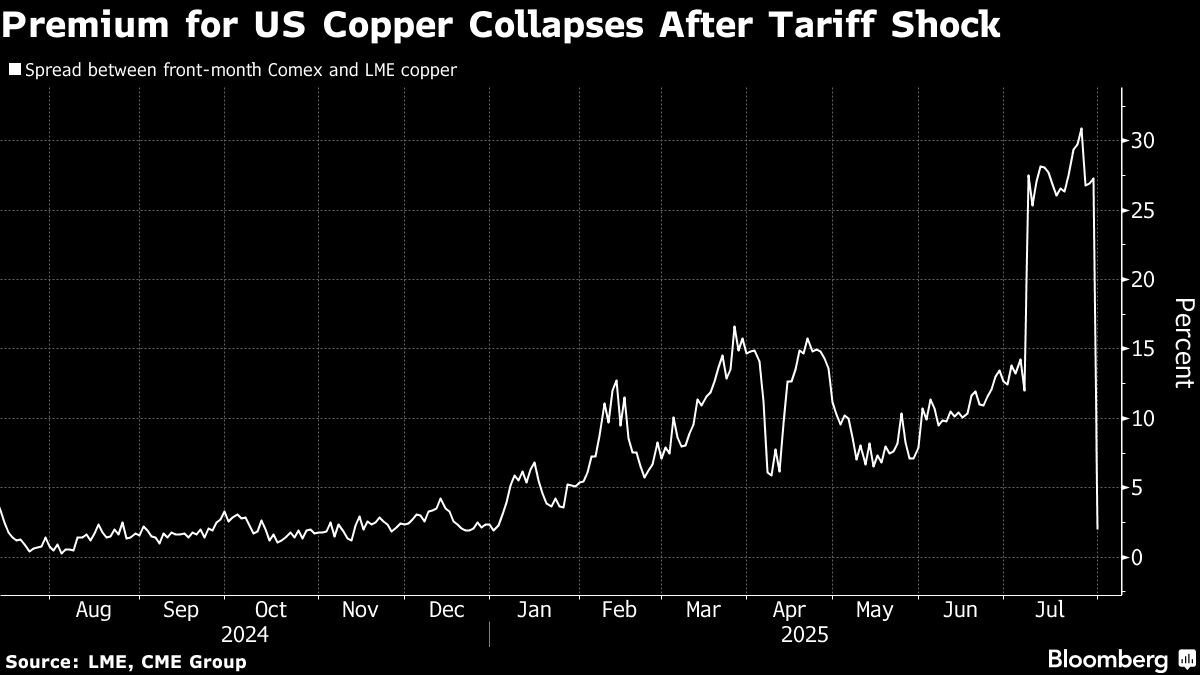 Pengumuman Trump tiga minggu lalu bahwa ia akan mengenakan tarif pada tembaga mulai 1 Agustus memicu perlombaan untuk mendapatkan tembaga melalui bea cukai AS sebelum tanggal tersebut — sebuah perlombaan yang sekarang tidak relevan.
