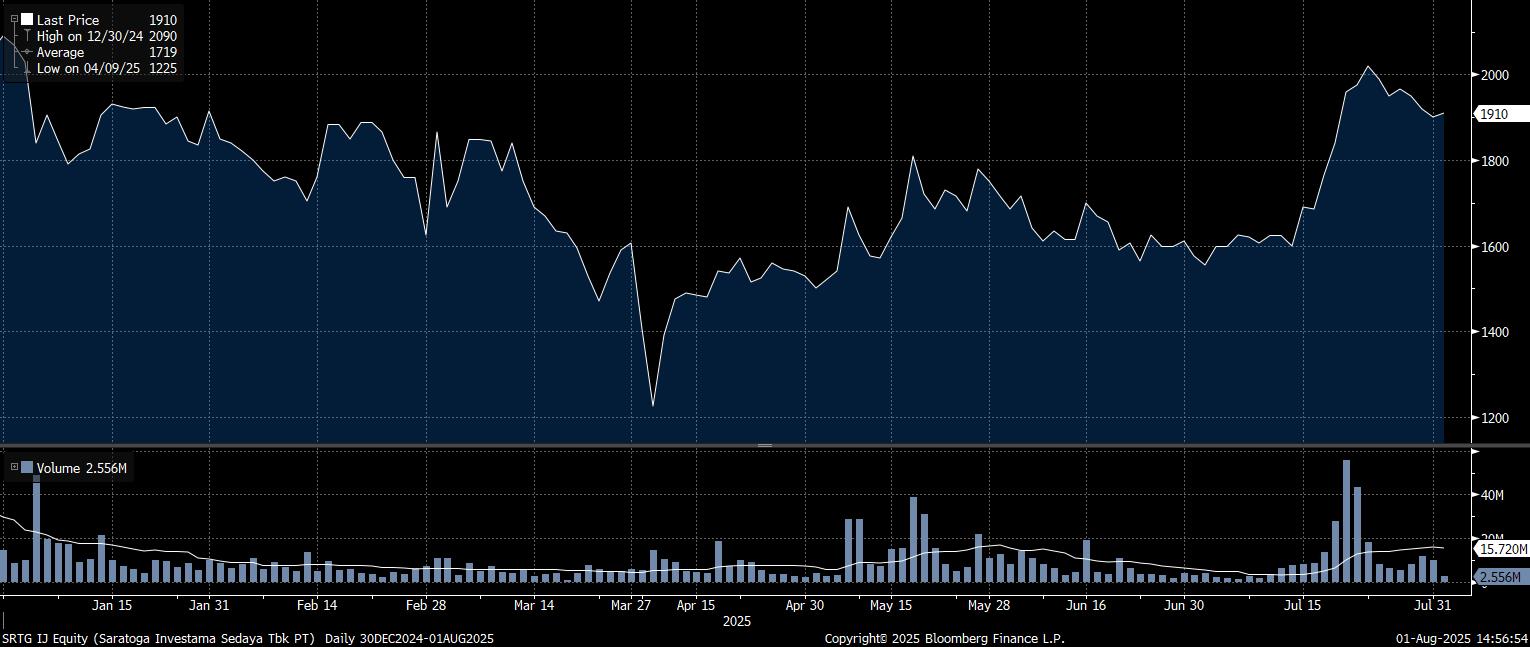 Adapun target harga saham SRTG secara konsensus ada di level Rp2.750/saham untuk 12 bulan ke depan. Dengan potensi cuan mencapai 44% pada saham Saratoga dari harga saat ini.