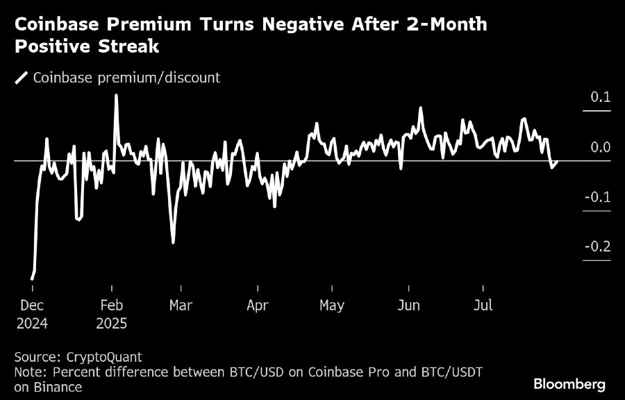 Premium Bitcoin di Coinbase, yang menjadi indikator minat investor AS, berbalik negatif minggu ini setelah hampir dua bulan menunjukkan angka positif, menurut CryptoQuant. Minat secara terbuka atau open interest pada kontrak berjangka Bitcoin dan Ether di CME juga turun masing-masing 13% dan 21% dari level tertinggi pada Juli.
