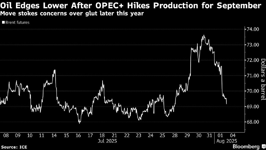 Minyak jenis Brent turun 0,5% menjaUS$69,32 per barel, sementara West Texas Intermediate (WTI) turun di bawah US$67, setelah OPEC+ menyetujui penambahan 547.000 barel per hari dari September, menyelesaikan pemulihan tahap pasokan yang dihentikan secara sukarela setahun lebih awal dari jadwal awal. Pada lapisan pasokan lain — sekitar 1,66 juta barel per hari produksi yang dibatasi — mungkin akan mengikuti, meskipun belum ada sinyal yang jelas.