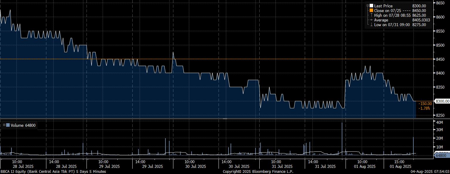 Adapun investor asing mencatat net sell tertinggi pada saham PT Bank Central Asia Tbk (BBCA) mencapai Rp2,09 triliun. Imbas tekanan jual investor asing, saham BBCA melemah 1,78% dalam sepekan di posisi Rp8.300/saham.