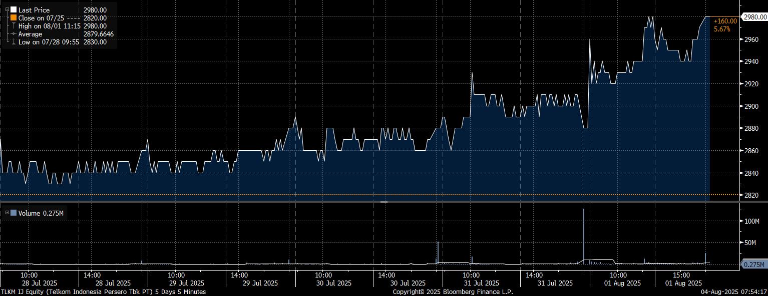 Pada kesempatan yang sama, investor asing tercatat net buy saham terbanyak pada emiten PT Telkom Indonesia Tbk (TLKM) mencapai Rp360,2 miliar. Sejalan dengan tren pembelian yang masif, saham TLKM menguat 5,67% dalam sepekan ke posisi Rp2.980/saham.