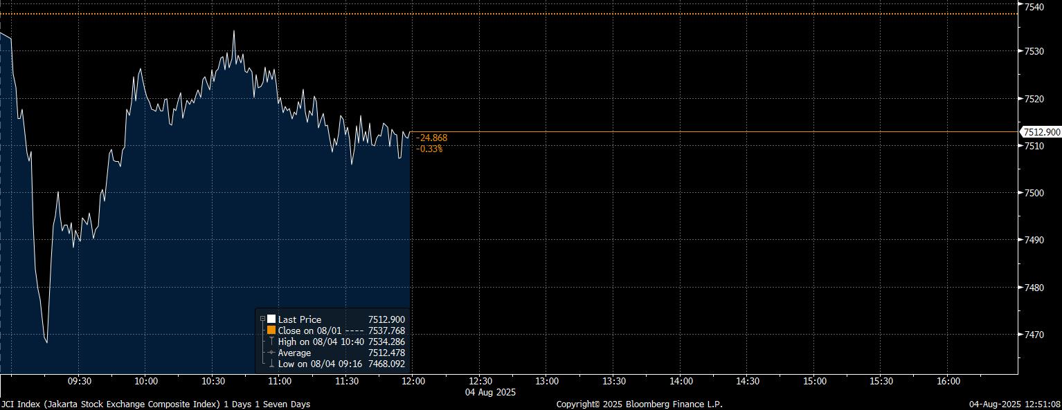 Bloomberg Technoz, Jakarta - Indeks Harga Saham Gabungan (IHSG) menutup perdagangan Sesi I di zona merah. IHSG melemah 24,86 poin (0,33%) di posisi 7.512,9 pada Senin (4/8/2025). Saham AMMN, MAPI, hingga PGEO jadi pemberat.