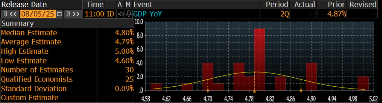 Badan Pusat Statistik akan merilis data pertumbuhan ekonomi Indonesia periode Kuartal II–2025 pada esok hari, Selasa. Konsensus Bloomberg yang melibatkan 30 analis/ekonom menghasilkan median proyeksi pertumbuhan ekonomi Indonesia sebesar 4,8% secara tahunan (year–on–year/yoy).