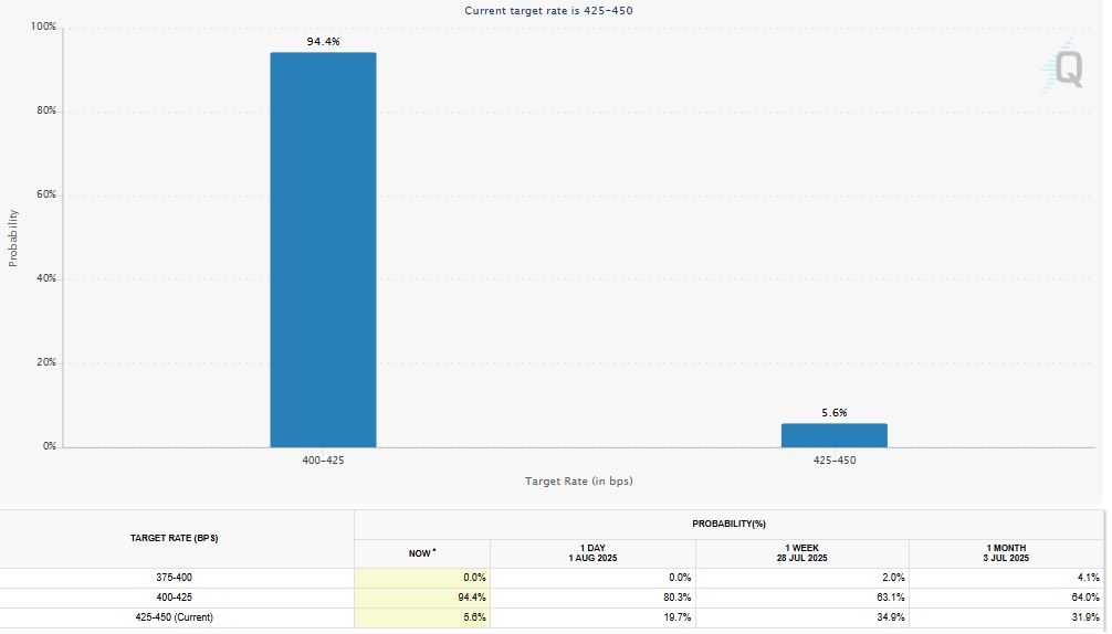 Pasar kini melihat peluang penurunan suku bunga acuan makin besar. Mengutip CME FedWatch, probabilitas penurunan Federal Funds Rate sebesar 25 basis poin (bps) menjadi 4-4,25% dalam rapat September mencapai 94,4%. Melonjak ketimbang posisi akhir pekan lalu yang masih 80,3%.