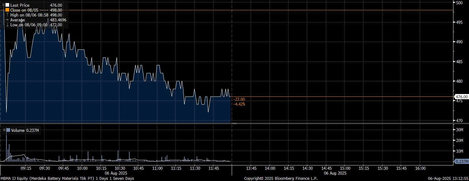LQ45 yang berisikan saham-saham unggulan ikut tertekan hingga menjadi pemberat utama IHSG antara lain, saham PT Merdeka Battery Materials Tbk (MBMA) ambles 4,42%, dan saham PT AKR Corporindo Tbk (AKRA) dengan pelemahan 3,04%.