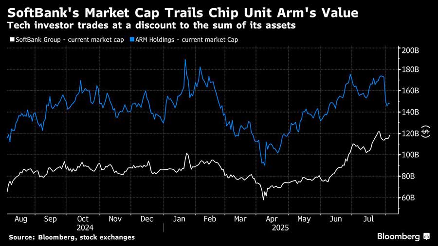 Saham SoftBank terus diperdagangkan dengan diskon sekitar 40% dari total asetnya — yang termasuk kepemilikan sekitar 90% di Arm yang bernilai US$148 miliar. Kapitalisasi pasar SoftBank saat ini sekitar US$118 miliar, hanya sebagian kecil dari valuasi Nvidia sebesar US$4,4 triliun dan valuasi perusahaan teknologi lain yang paling erat terkait dengan kemajuan AI.
