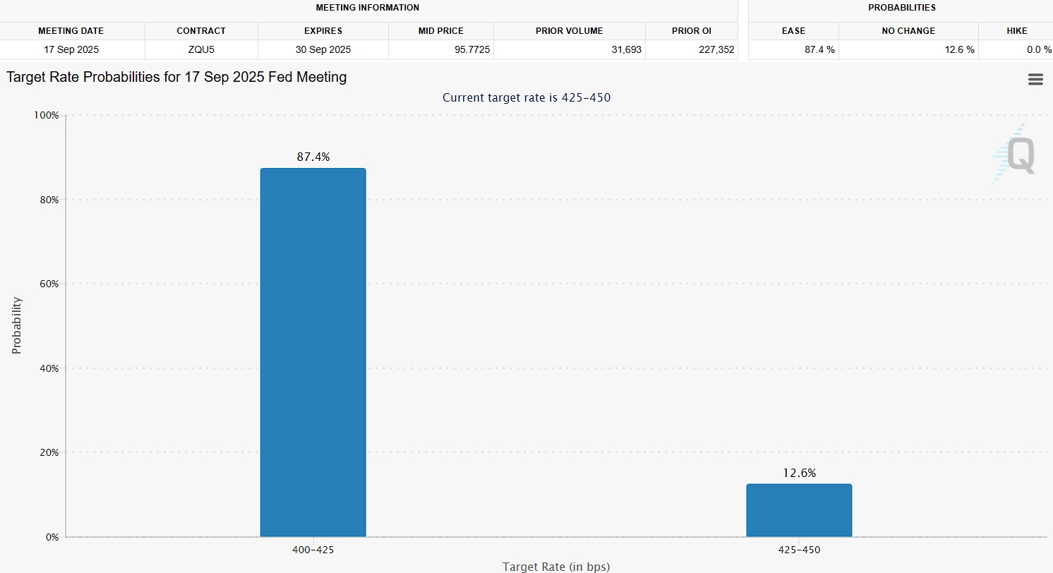 Mengutip CME FedWatch hari ini, kemungkinan penurunan Federal Funds Rate sebesar 25 basis poin menjadi 4—4,25% dalam rapat September mencapai 87,4%.