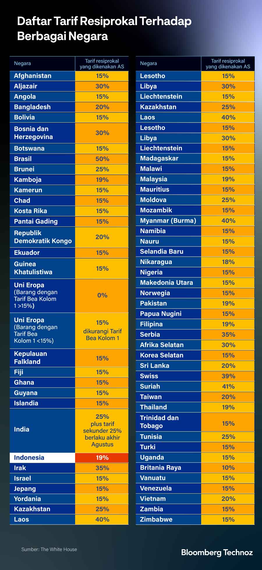 Berikut daftar tarif resiprokal terhadap berbagai negara yang telah disesuaikan: