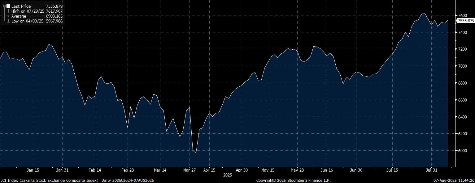 Bloomberg Technoz, Jakarta - Indeks Harga Saham Gabungan (IHSG) pada perdagangan Kamis (7/8/2025) mencatat penguatan optimistis. IHSG menguat 0,49% ke posisi 7.540. IHSG bahkan menyentuh level tertinggi 7.580 pada pukul 9.10 WIB pagi tadi.