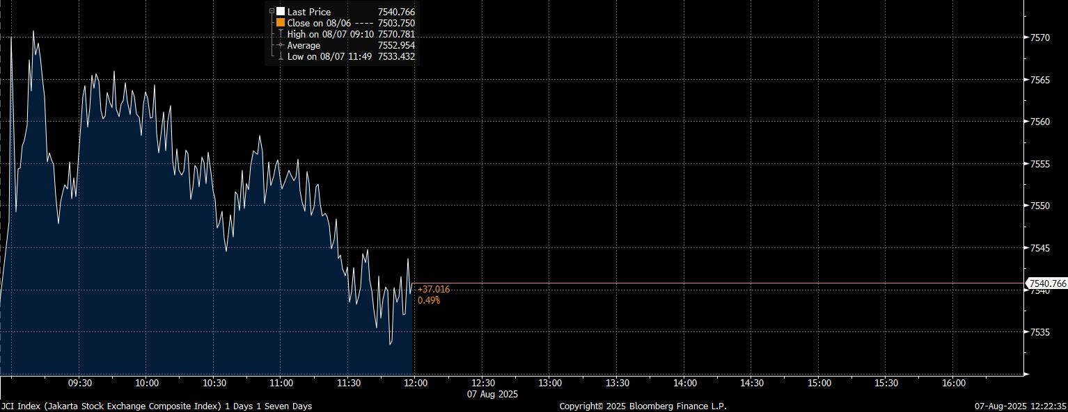Bloomberg Technoz, Jakarta - Indeks Harga Saham Gabungan (IHSG) pada Sesi I Kamis (7/8/2025), berhasil ditutup di zona hijau dengan menguat 37,01 poin atau dengan kenaikan 0,49% di posisi 7.540,76.