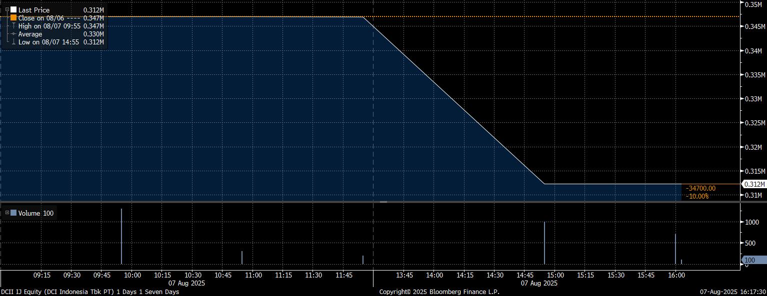 Jadi sebab penurunan tersebut, sejumlah saham berguguran hingga melemah dua digit. Salah satunya yang paling berat bobotnya adalah emiten data center milik taipan teknologi Toto Sugiri, saham PT DCI Indonesia Tbk (DCII)