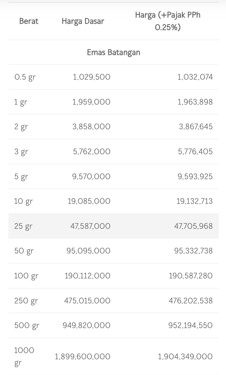 Berikut harga emas Logam Mulia Antam selengkapnya untuk hari ini:
