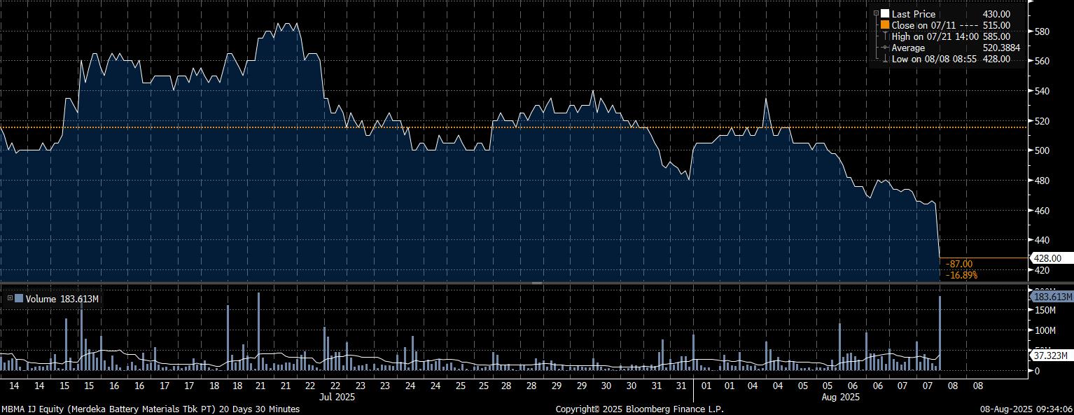 Saham Merdeka Battery Materials (MBMA) yang tidak lagi MSCI Indonesia Index, MSCI Small Cap, memang mengalami penurunan prestasi dari sisi harga saham. Dalam satu tahun perdagangan, harga saham MBMA jatuh. Saham MBMA memasuki tren penurunan dan itu terjadi hingga pagi ini, hingga mencatatkan pelemahan harga saham mencapai 16,89% point–to–point.