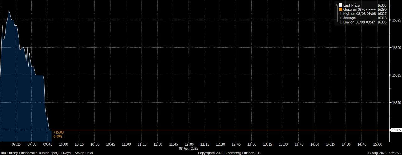 Pada Jumat (8/8/2025) pukul 09:50 WIB, US$ 1 setara dengan Rp 16.305 di perdagangan pasar spot. Rupiah terdepresiasi tipis 0,09% dibandingkan hari sebelumnya.