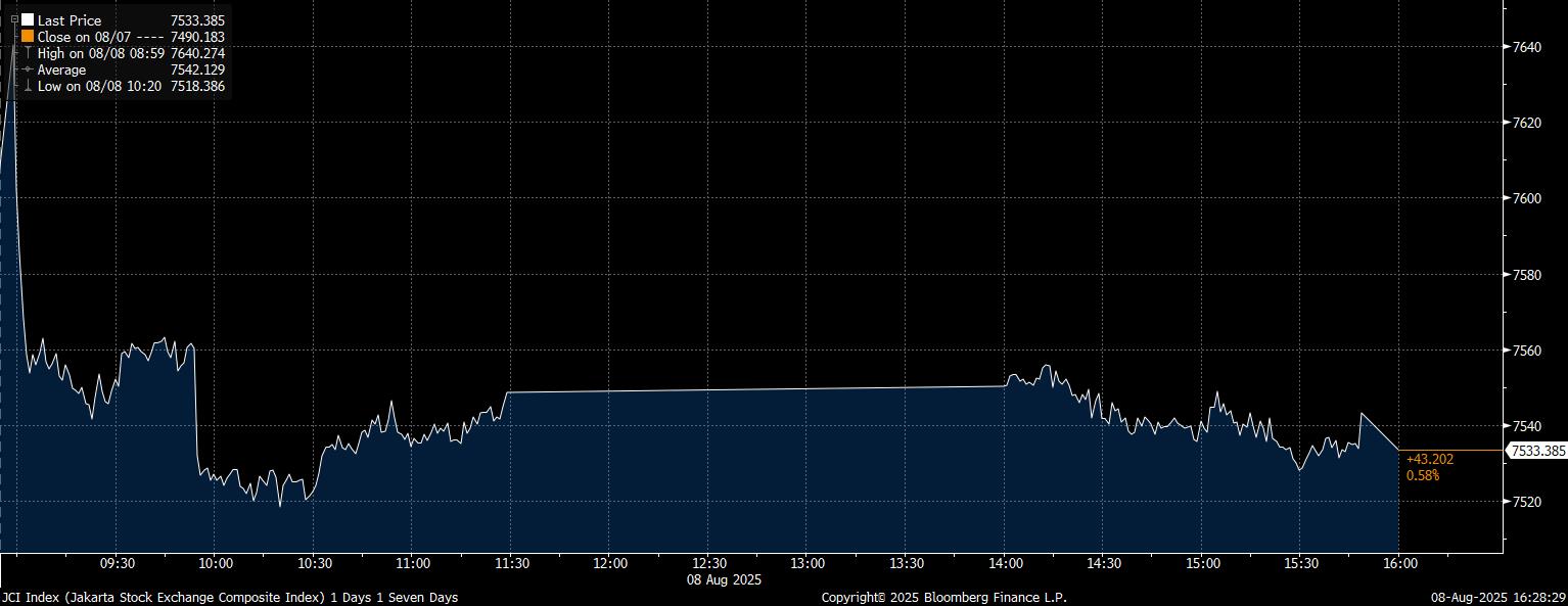 Bloomberg Technoz, Jakarta - IHSG melaju positif pada perdagangan hari ini dengan penguatan 43,2 poin atau dengan kenaikan 0,58% ke level 7.533,38 pada Jumat (8/8/2025) yang didorong oleh menguatnya saham DSSA, BREN, sampai dengan saham CUAN.