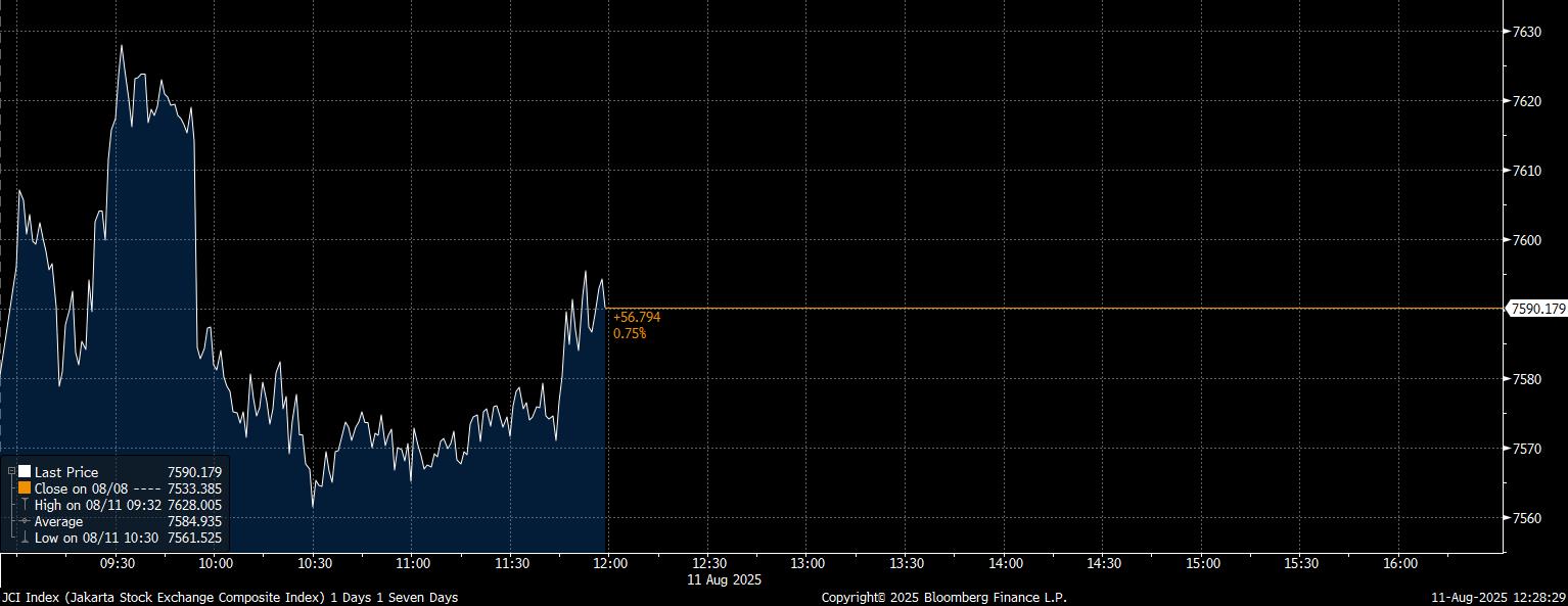 Bloomberg Technoz, Jakarta - Indeks Harga Saham Gabungan (IHSG) melesat di zona hijau dengan penguatan mencapai 0,75% (56,79 poin) ke posisi 7.590,17 pada Sesi I perdagangan Senin (11/8/2025).