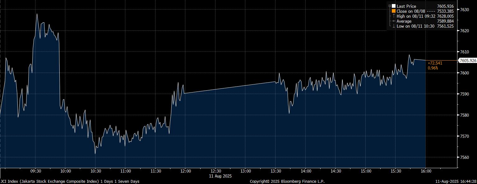 Bloomberg Technoz, Jakarta - Indeks Harga Saham Gabungan (IHSG) pada perdagangan Senin (11/8/2025) kenaikannya semakin melesat hingga berhasil berada di atas level resistance 7.600. Hingga tutup dagang, IHSG mencatat kenaikan mencapai 0,96% di posisi 7.605,92.