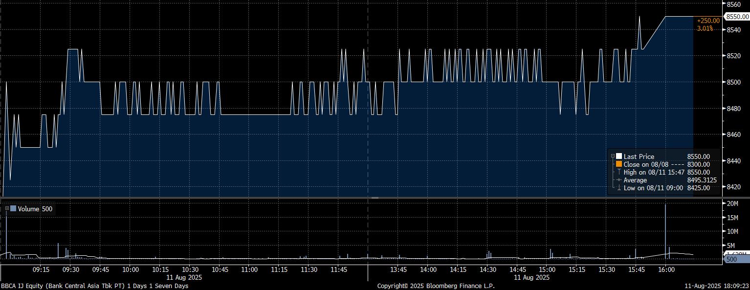 Adapun investor asing mencatatkan net buy terbanyak pada saham PT Bank Central Asia Tbk (BBCA) mencapai Rp425,11 miliar. Seiringan dengan tren pembelian, saham BBCA menguat 3% hingga terapresiasi di posisi Rp8.550/saham.