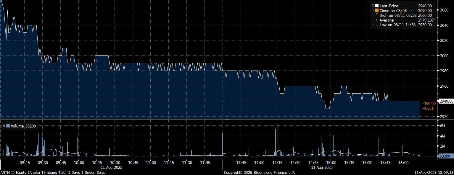 Sedang pada kesempatan yang sama, investor asing net sell yang besar pada saham PT Aneka Tambang Tbk (ANTM) mencapai Rp154,41 miliar. Bersamaan dengan tekanan jual, saham ANTM melemah 4,85% di posisi Rp2.940/saham.