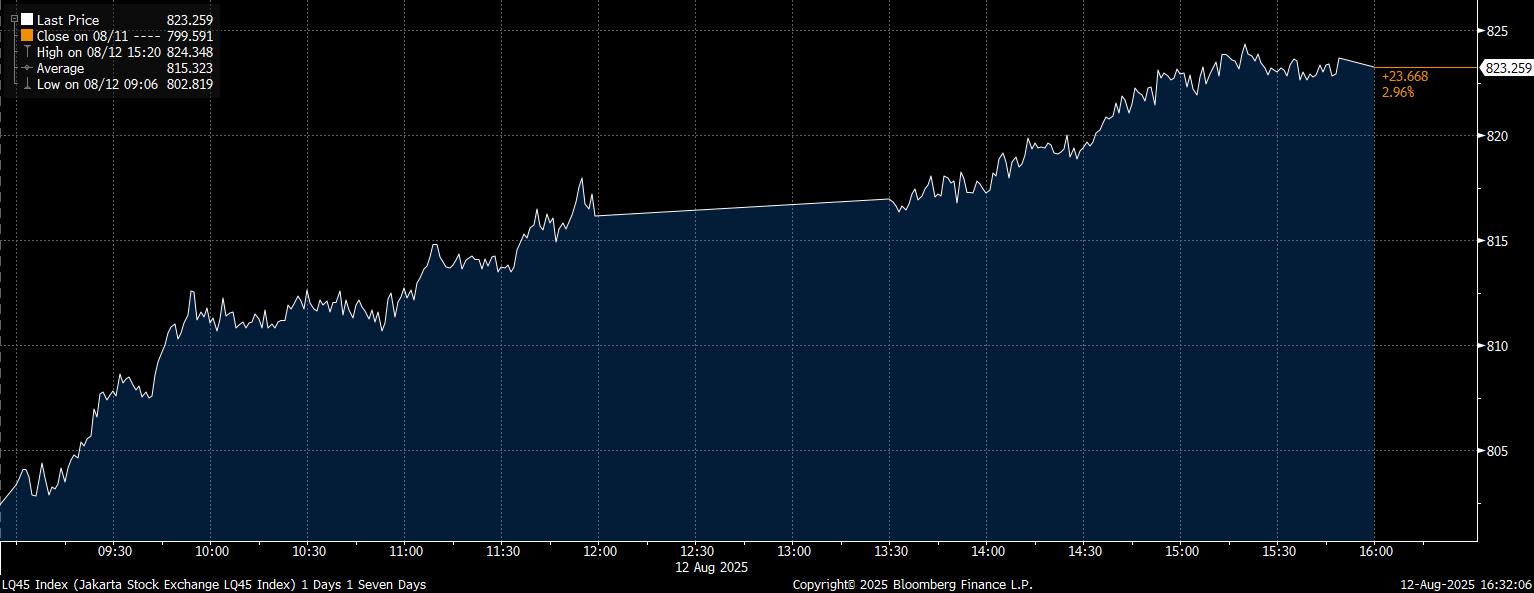 Senada dengan IHSG, saham LQ45 yang berisikan saham–saham unggulan ikut menguat, dan menetap di zona hijau, dengan kenaikan 2,96% di posisi terbaiknya 823,25.