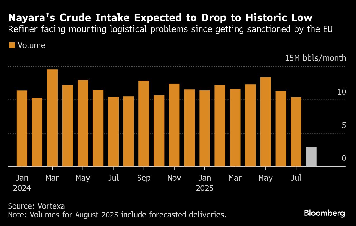 Ekspor Nayara yang sudah berada di laut sebelum perusahaan disanksi Uni Eropa pada 18 Juli pun tertahan mencari pembeli. Satu kargo ultra-low sulfur diesel yang dimuat di kapal EM Zenith pada hari itu sempat berlabuh di Selat Malaka hingga Selasa malam, sebelum tercatat berlayar ke China.