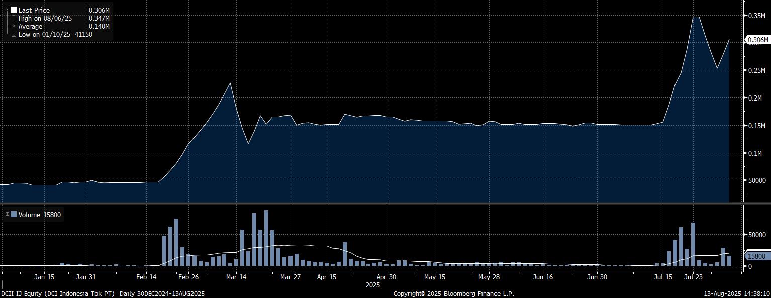 Harga saham DCII pada perdagangan siang hari, Rabu (13/8/2025), tercatat pada level Rp306.075/saham, melejit 627% sepanjang tahun ini. Pada harga tersebut, nilai kapitalisasi saham yang juga digenggam langsung Anthoni Salim mencapai Rp729,6 triliun.