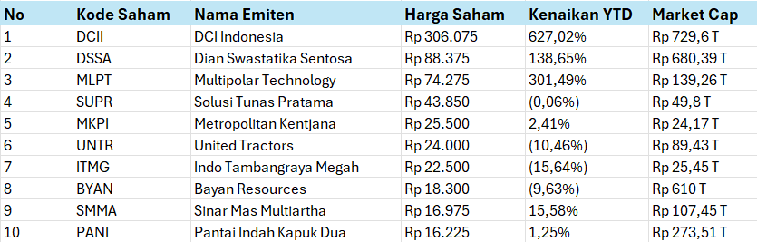 Gelar saham termahal ini membuat investor harus merogoh kocek lebih dari Rp30 juta hanya untuk membeli 1 lot saham DCII.