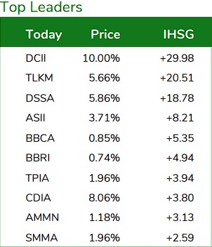 Dari poin kenaikan tersebut, sebesar 29,98 poin disumbang oleh kenaikan harga saham DCII. Posisi ini menjadikannya saham dengan kontribusi terbesar kenaikan indeks harian.