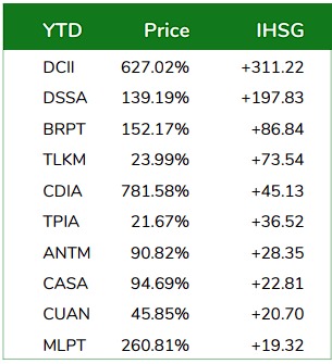 Kenaikan harga kemarin bahkan membuat saham DCII berkontribusi hingga 311,22 poin terhadap kenaikan IHSG sejak awal tahun. Disusul di tempat kedua, ada saham PT Dian Swastatika Sentosa Tbk (DSSA) yang berkontribusi 197,83 poin.