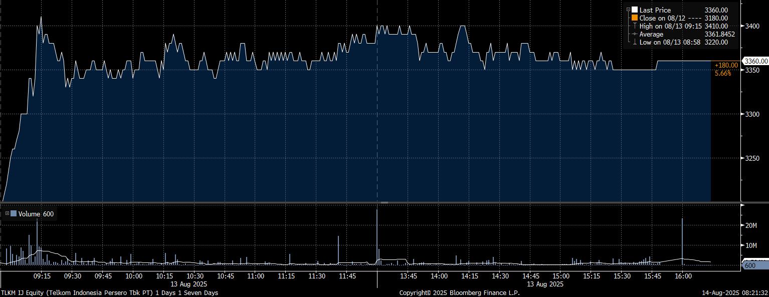 Bloomberg Technoz, Jakarta - Pada perdagangan saham kemarin, Rabu 13 Agustus 2025, Indeks Harga Saham Gabungan (IHSG) ditutup di zona hijau dengan penguatan 1,3% hingga melesat ke posisi 7.892,91.