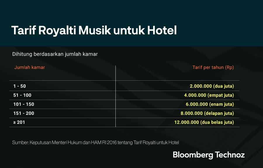 Dasar penetapan tarif royalti ditetapkan secara proposional. Hotel yang dimaksud mencakup losmen, resor, hotel eksklusif, dan hotel butik. Tarif royalti hotel dihitung berdasarkan jumlah kamar.