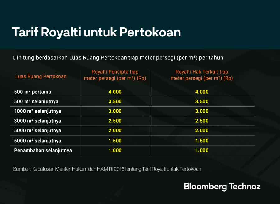 Tarif royalti untuk pertokoan seperti, supermarket, pasar swalayan, komplek pertokoan [mal], toko, distro, salon kecantikan, pusat kebugaran, arena olah raga dan ruang pamer (show room) dihitung berdasarkan luas ruang pertokoan tiap meter persegi per tahun.
