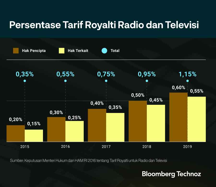 - Tarif royalti untuk Televisi Bebas Mengudara/Terestrial (free to air televisions) dan Televisi Berbasis Jaringan Internet (simulcasting & webcasting/streaming televisions) dihitung berdasarkan jumlah pendapatan dari iklan tahun sebelumnya yang telah diaudit oleh Akuntan Publik dikalikan dengan prosentase tarif sebagaimana ditetapkan.
