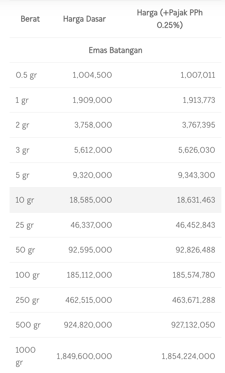 Berikut daftar harga emas Logam Mulia Antam selengkapnya untuk hari ini: