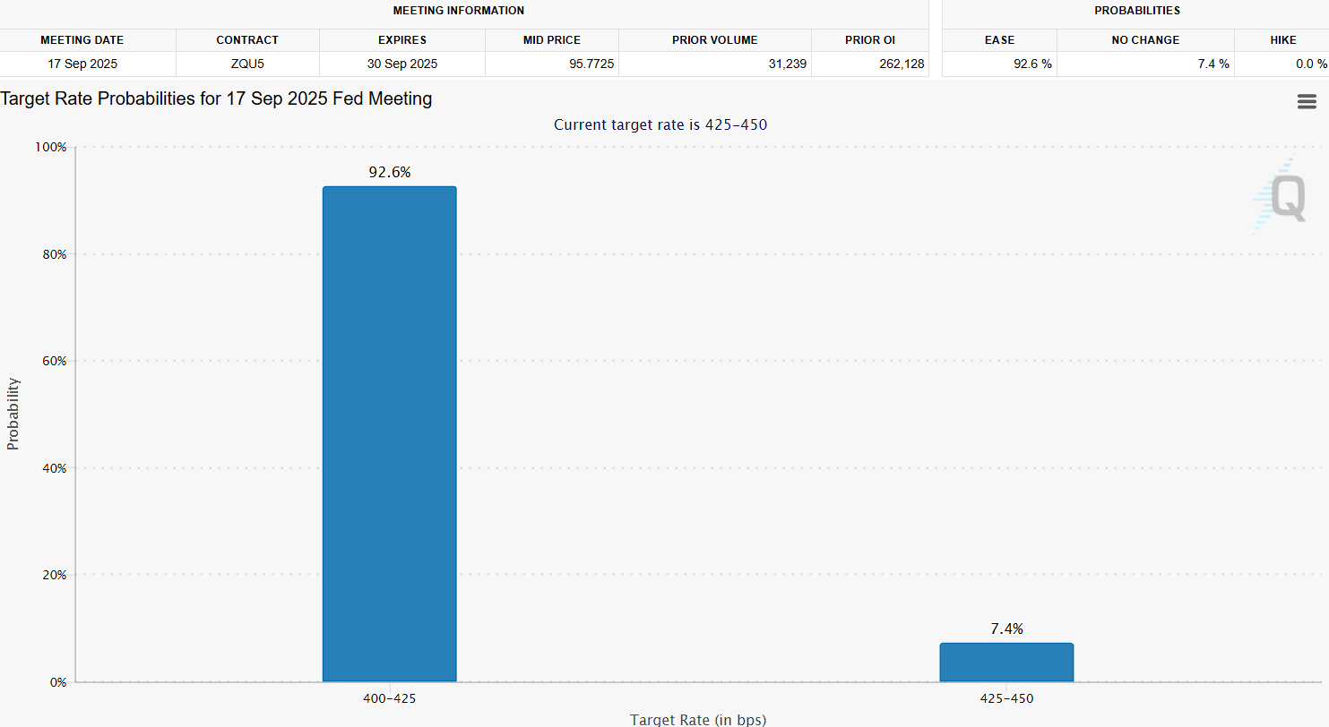 Mengutip CME FedWatch, probabilitas pemangkasan Federal Funds Rate sebesar 25 basis poin (bps) menjadi 4–4,25% adalah 92,6%. Turun atau lebih pesimis dilihat dari perhitungan peluang hari sebelumnya yang sebesar 94,3%.