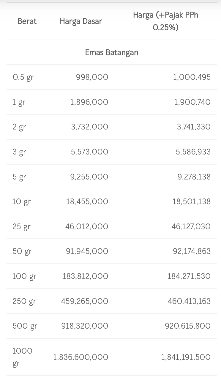 Berikut harga emas Logam Mulia Antam selengkapnya untuk hari ini: