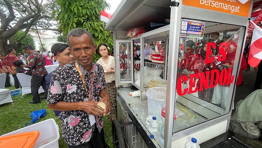 Salah satunya merupakan Suntoro, penjual cendol yang biasa berjualan di daerah Veteran II, Jakarta Pusat turut memeriahkan pesta rakyat tersebut.