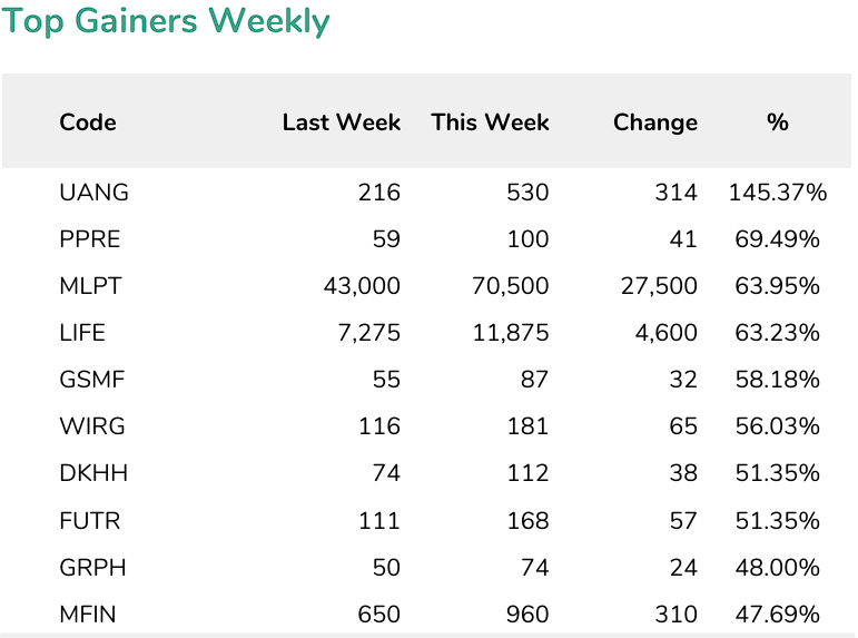 Berikut adalah saham-saham yang menjadi top gainers sepanjang pekan ini, di mana tertinggi mencatatkan penguatan lebih dari 145%:
