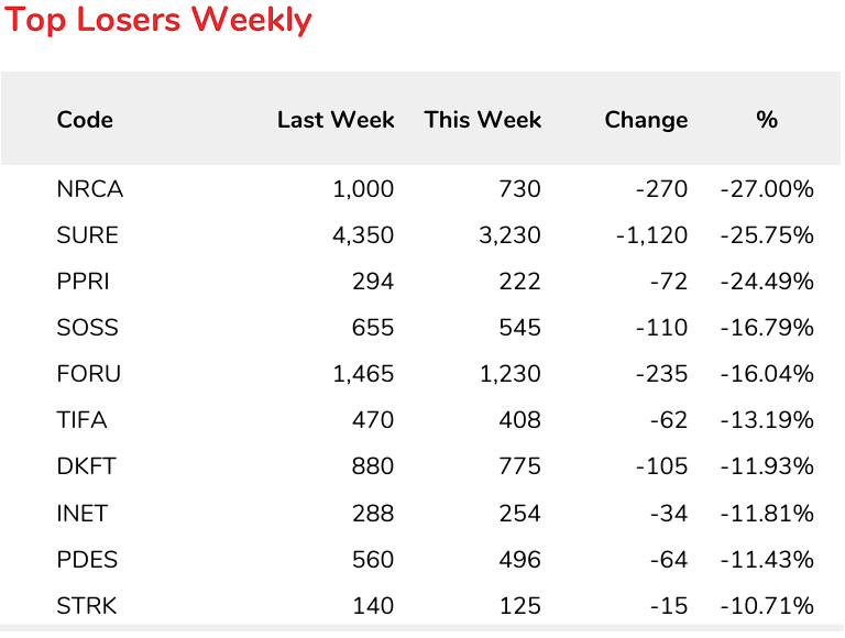 Berikut adalah saham-saham yang menjadi top losers minggu ini, di mana ada yang anjlok sampai 27%: