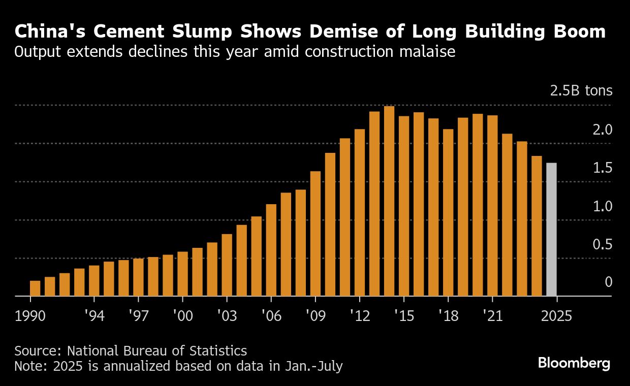 Bloomberg, China mencatatkan produksi semen, salah satu komoditas yang mencerminkan kondisi perekonomian negara tersebut, menurun pada Juli 2025. Hal ini mengindikasikan dalamnya perlambatan pembangunan di negara itu setelah hiruk-pikuk dekade sebelumnya.