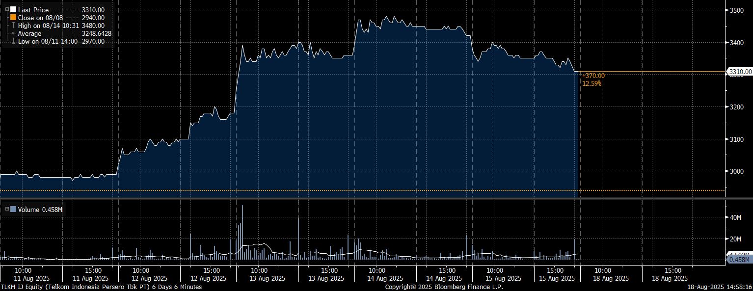 - TLKM menguat 12,59% ke level Rp3.310/saham
