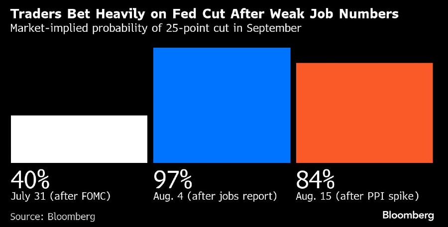 Spekulasi ini melonjak setelah laporan tenaga kerja Juli yang mengecewakan, yang juga merevisi data penggajian bulan-bulan sebelumnya ke bawah. Dan spekulasi ini hanya sedikit berkurang setelah kejutan inflasi pekan lalu.