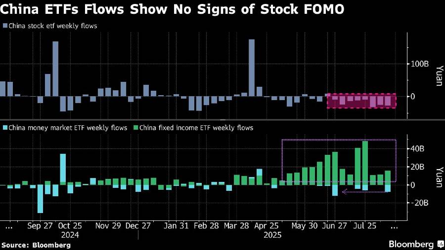 Saham China yang diperdagangkan di bursa ETF mengalami penjualan selama delapan pekan beruntun hingga 15 Agustus, menurut data yang dihimpun Bloomberg, meski indeks CSI 300 naik lebih dari 9% selama periode tersebut.