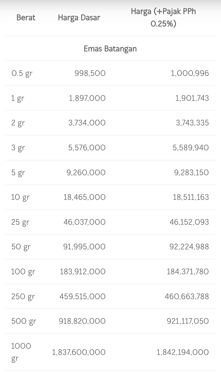 Berikut perkembangan harga emas Logam Mulia Antam selengkapnya untuk hari ini: