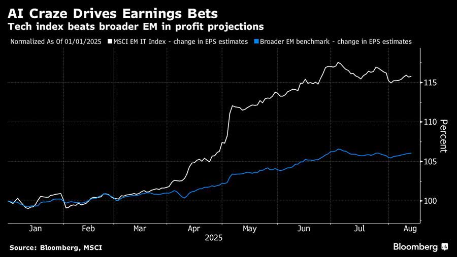 Didorong oleh keberhasilan pengembang AI China, DeepSeek, dan perusahaan-perusahaan semikonduktor terkemuka di Asia, manajer aset seperti AllSpring Global Investments dan GIB Asset Management makin memfokuskan portofolio mereka pada saham-saham AI. Hal ini merupakan perdagangan yang menguntungkan, dengan perusahaan-perusahaan AI menjadi enam kontributor terbesar bagi reli indeks saham EM Bloomberg 2025.