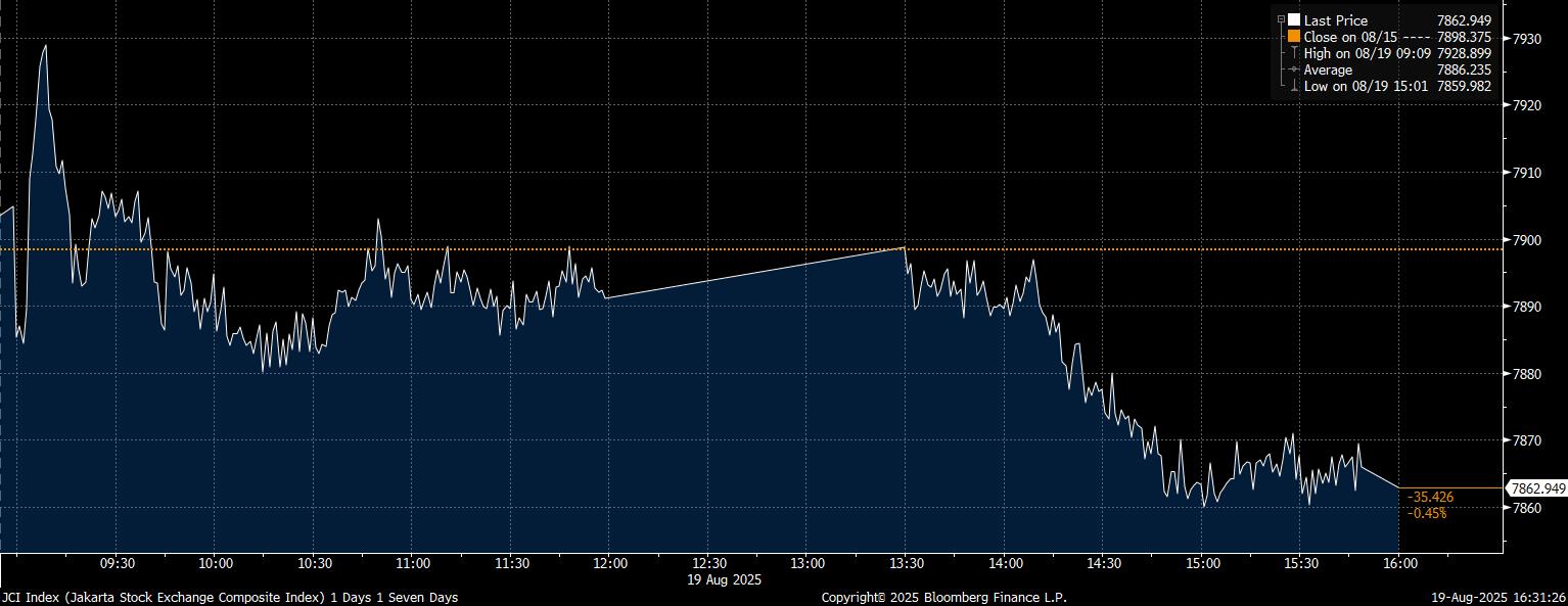 Bloomberg Technoz, Jakarta - Pelemahan Indeks Harga Saham Gabungan (IHSG) pada hari ini semakin dalam. Hingga tutup perdagangan Selasa (19/8/2025), IHSG ditutup melemah 35,42 poin (0,45%) ke level 7.862,94.